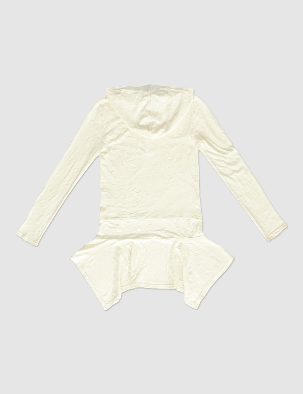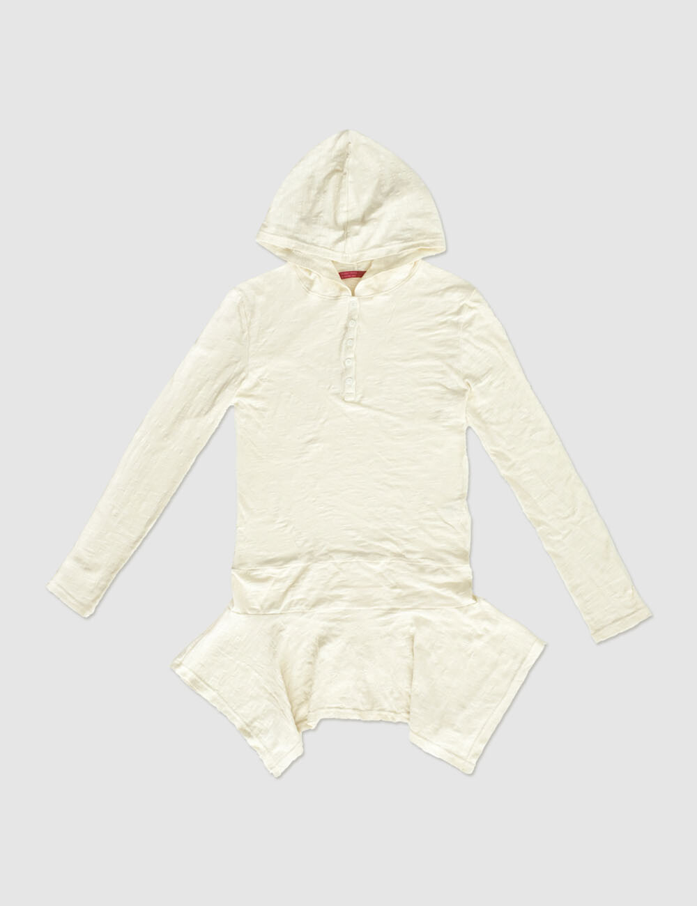 큰 후드와 함께 밑단 스커트의 독특한 패턴이 특징인 제품입니다.