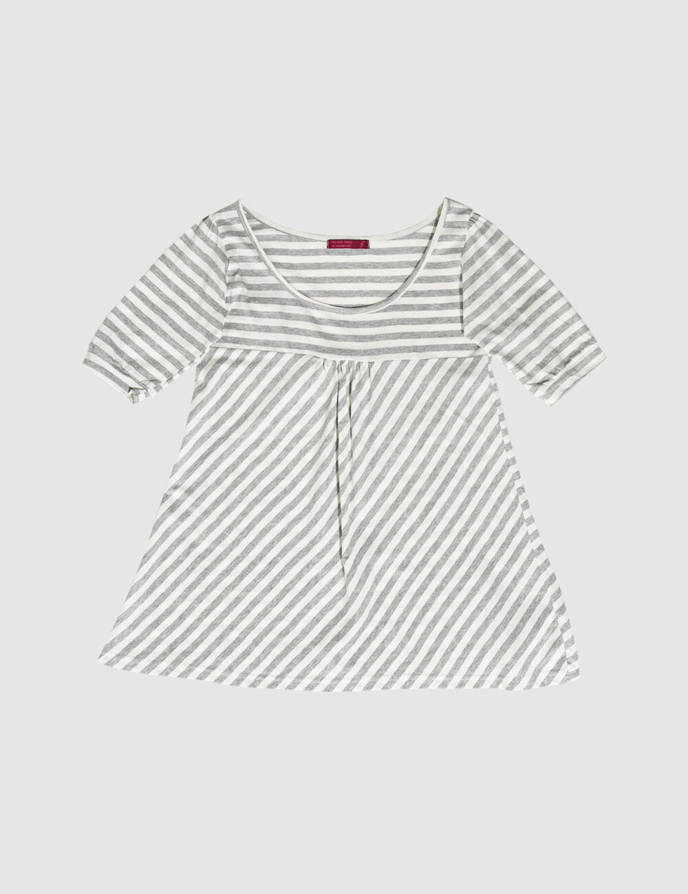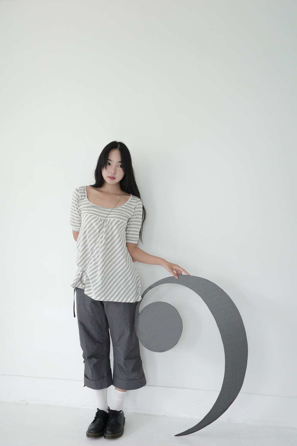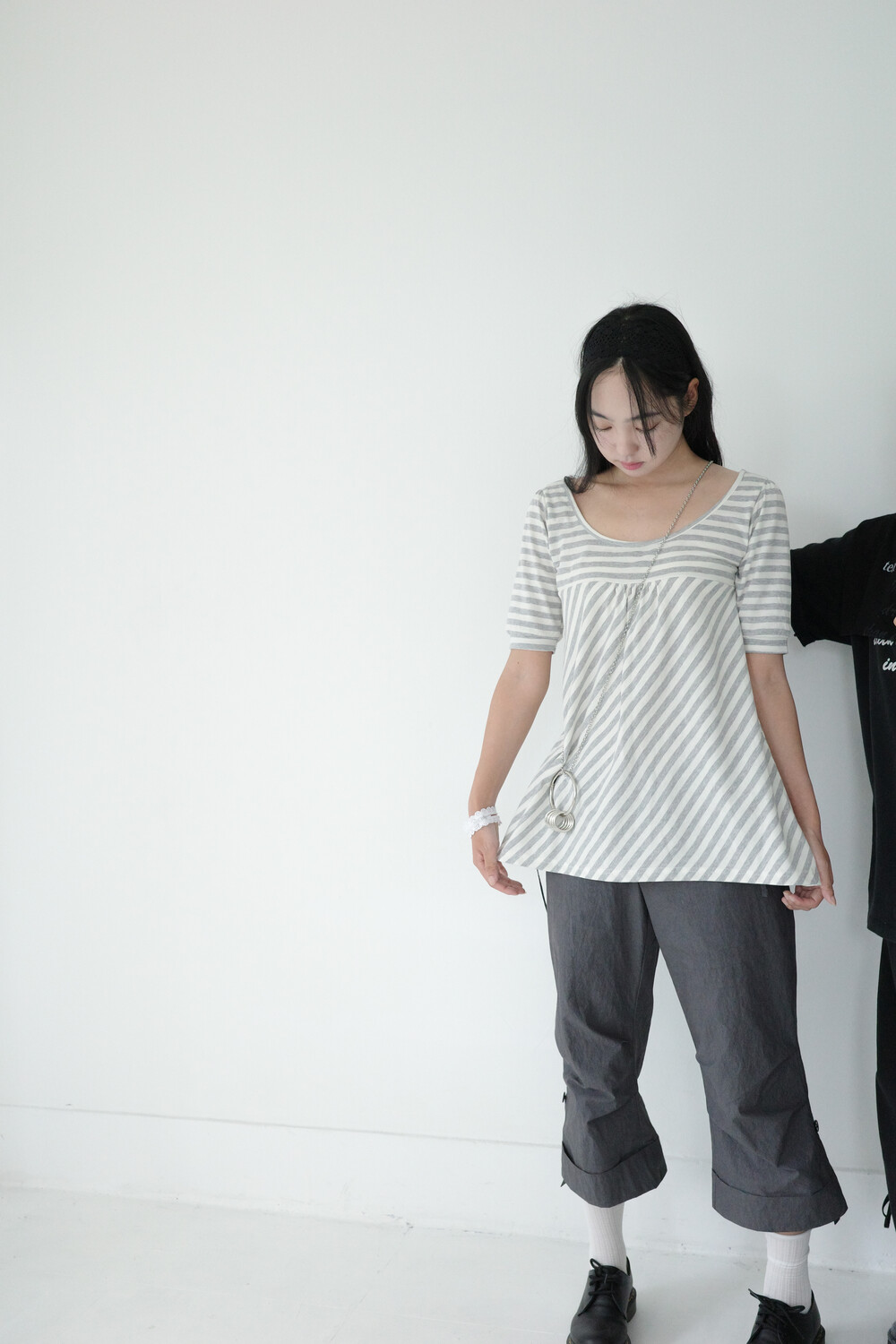 5부 소매 길이와 스쿱넥 형태로 제작되어 한층 페미닌한 무드로 착용 가능한 탑입니다. 전면 몸통 부분은 스트라이프 패턴을 사선으로 배치하여 제작하였습니다.