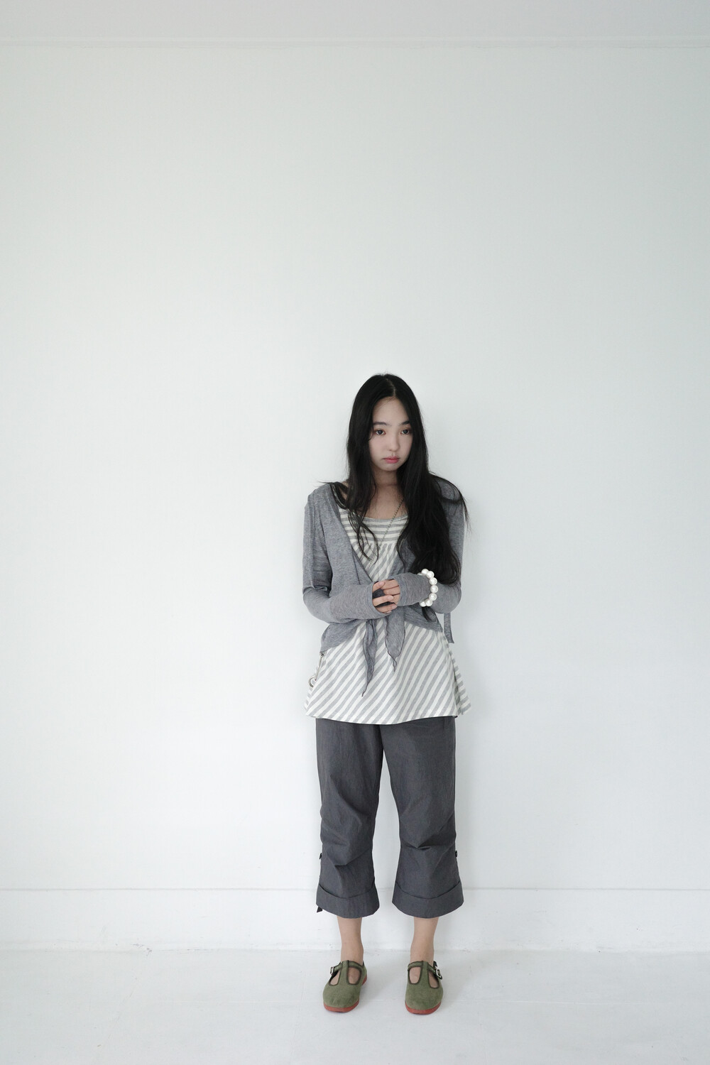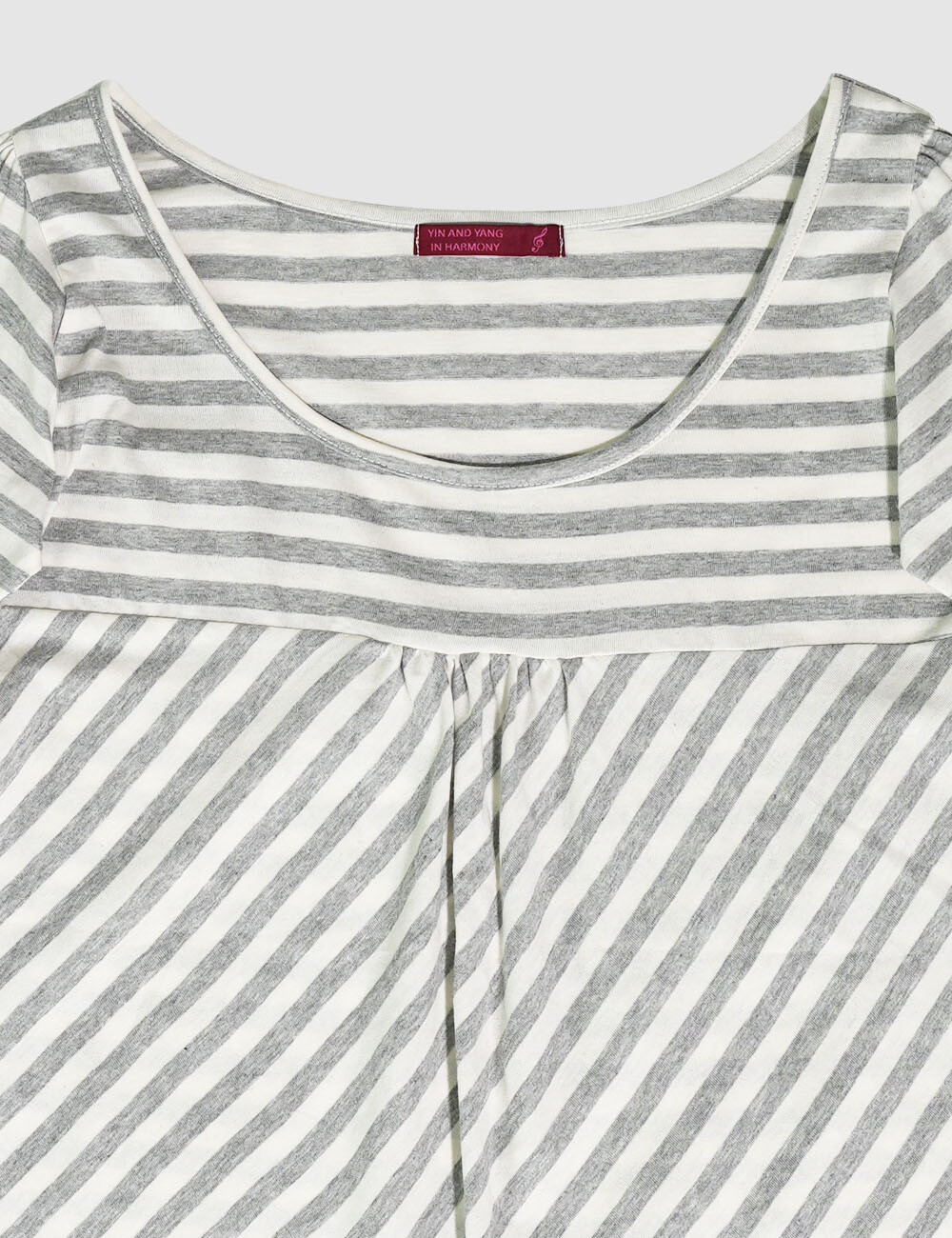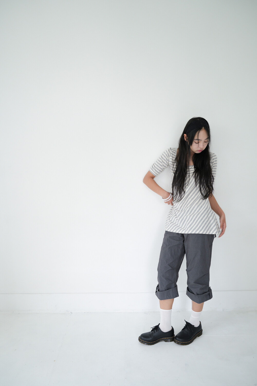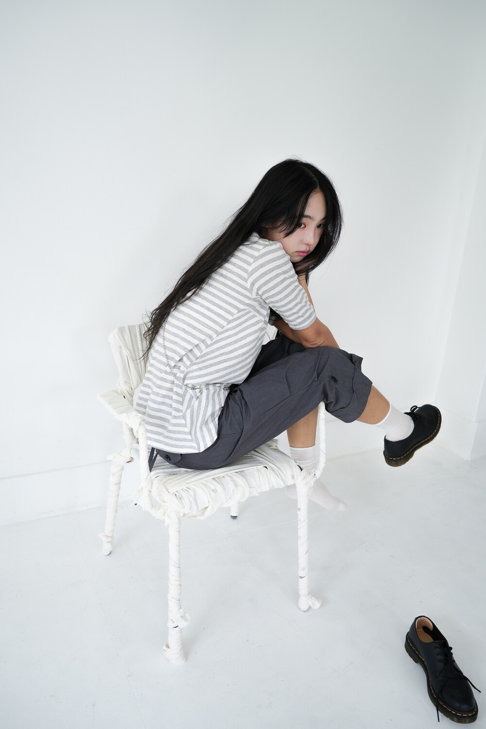 5부 소매 길이와 스쿱넥 형태로 제작되어 한층 페미닌한 무드로 착용 가능한 탑입니다. 전면 몸통 부분은 스트라이프 패턴을 사선으로 배치하여 제작하였습니다.