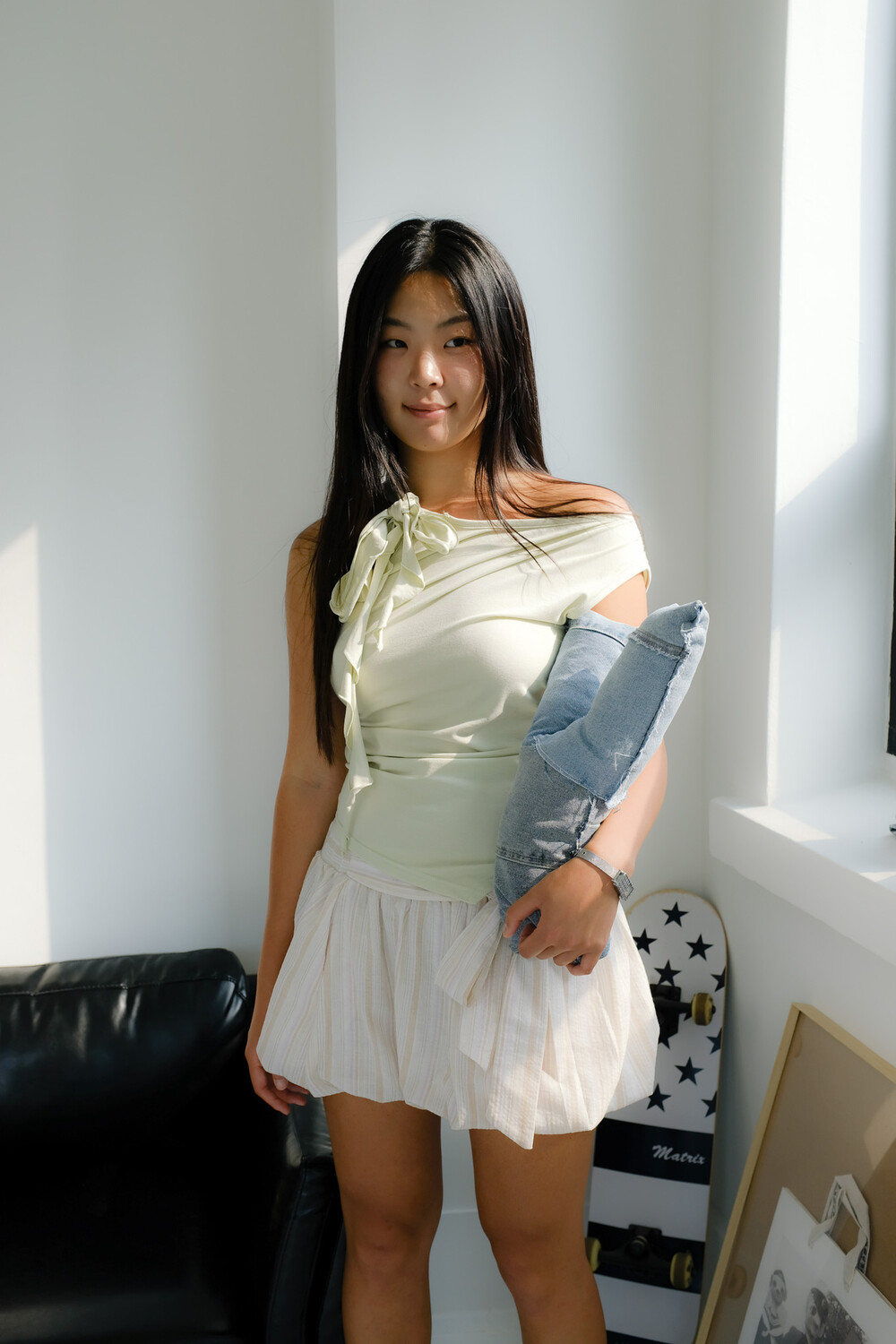 스트랩을 이용해 다양한 연출이 가능한 슬리브리스입니다.