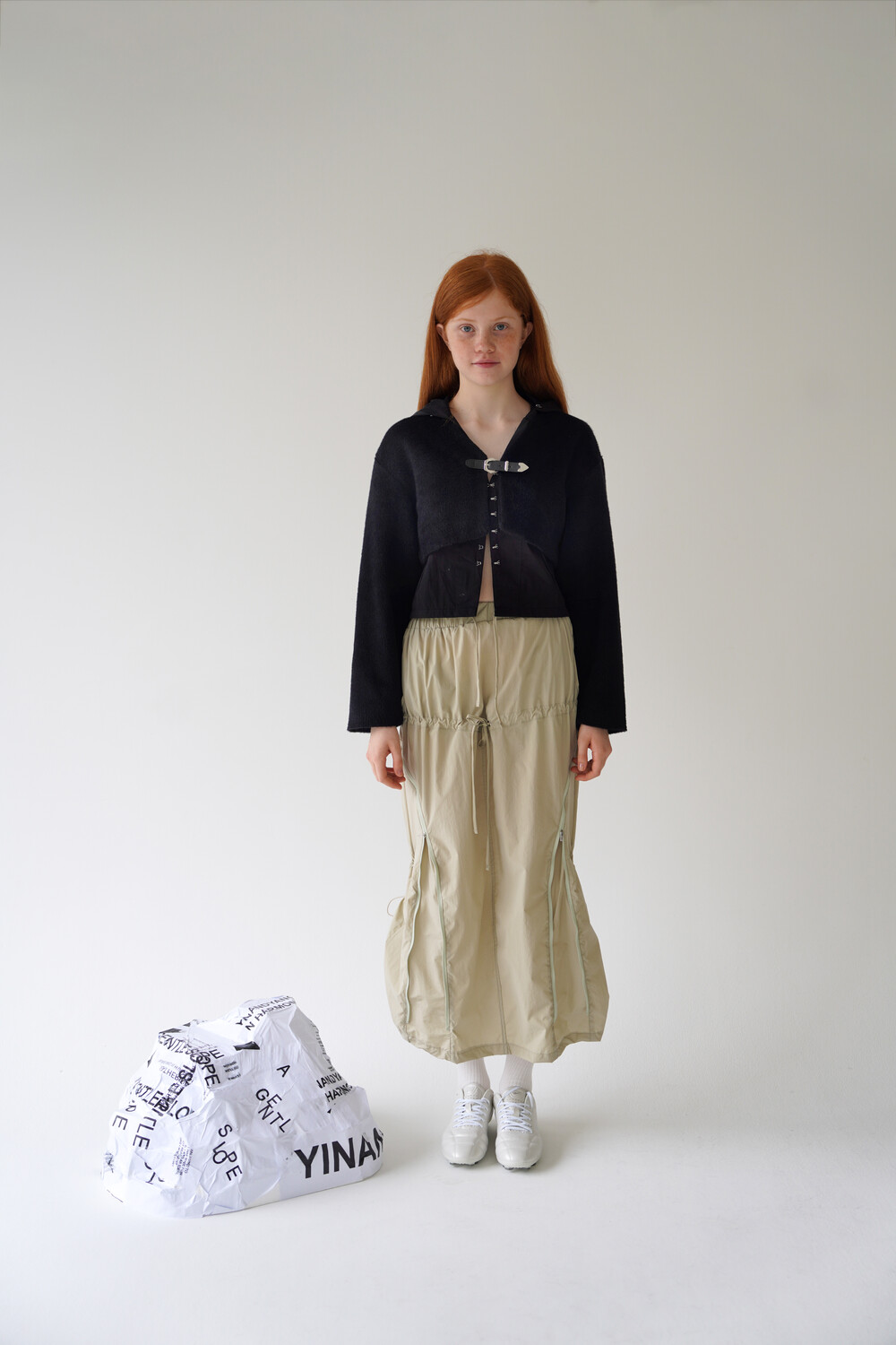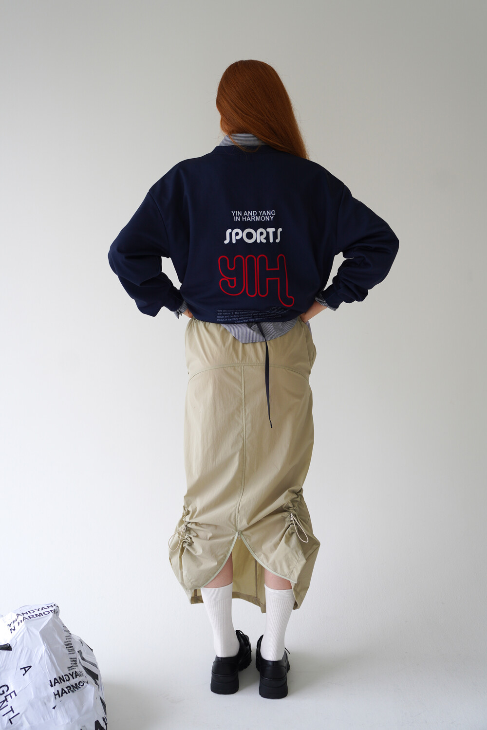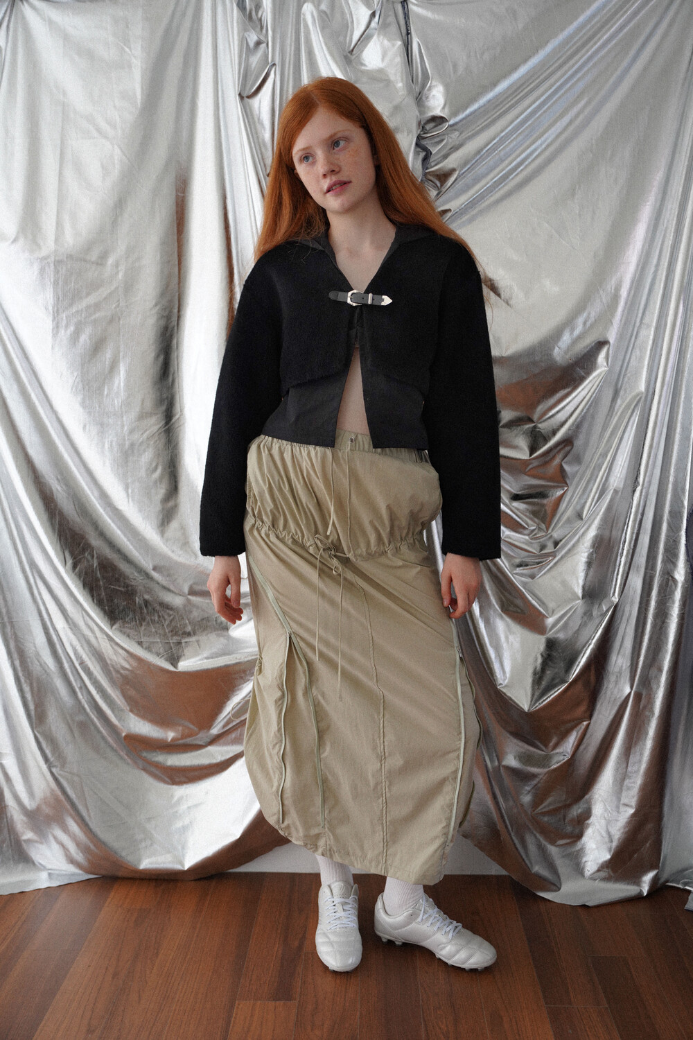 전면의 지퍼와 스트랩 셔링 디테일, 후면의 스트링 조절로 다양한 실루엣 연출이 가능한 스커트입니다.