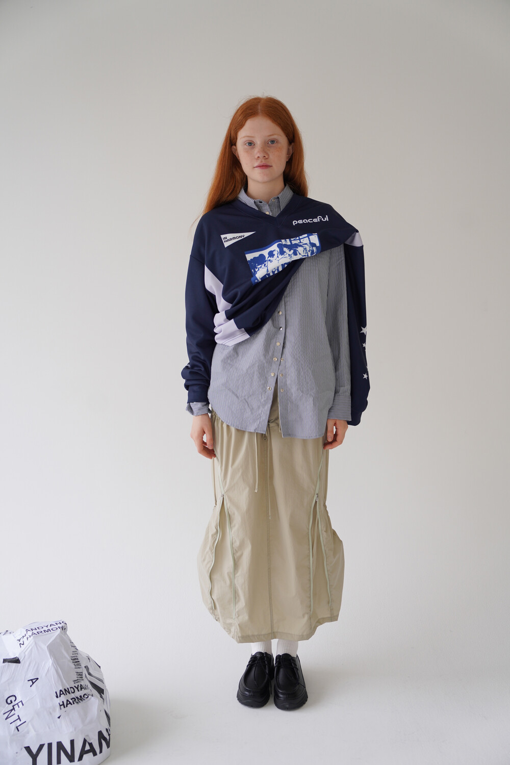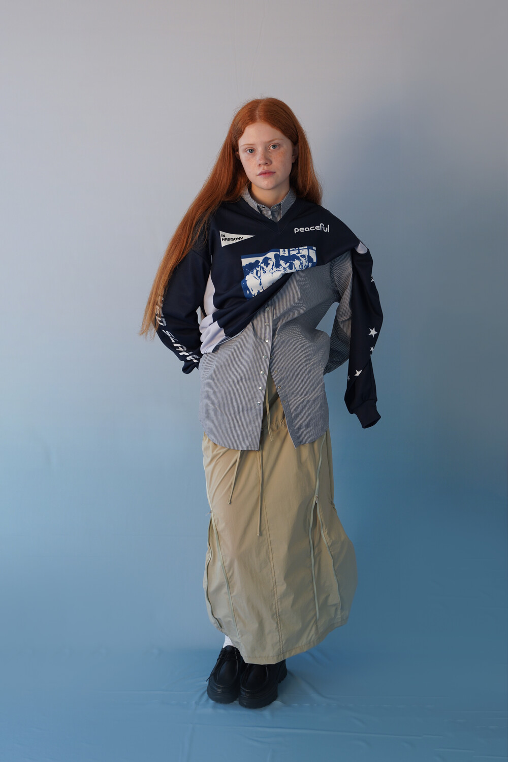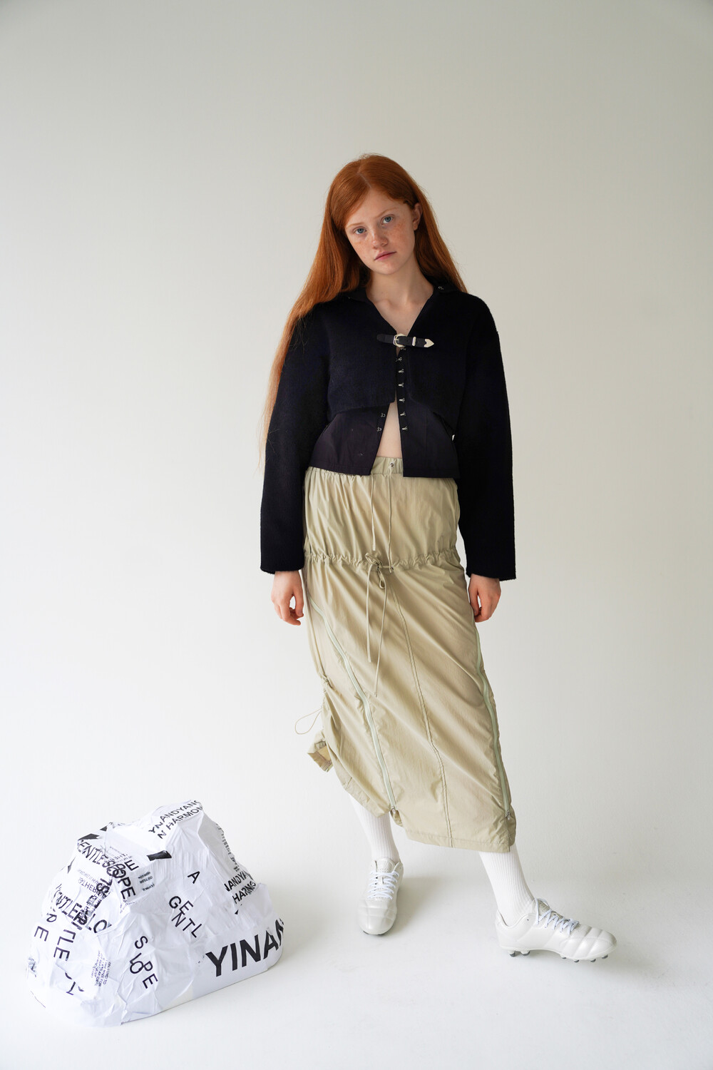 전면의 지퍼와 스트랩 셔링 디테일, 후면의 스트링 조절로 다양한 실루엣 연출이 가능한 스커트입니다.