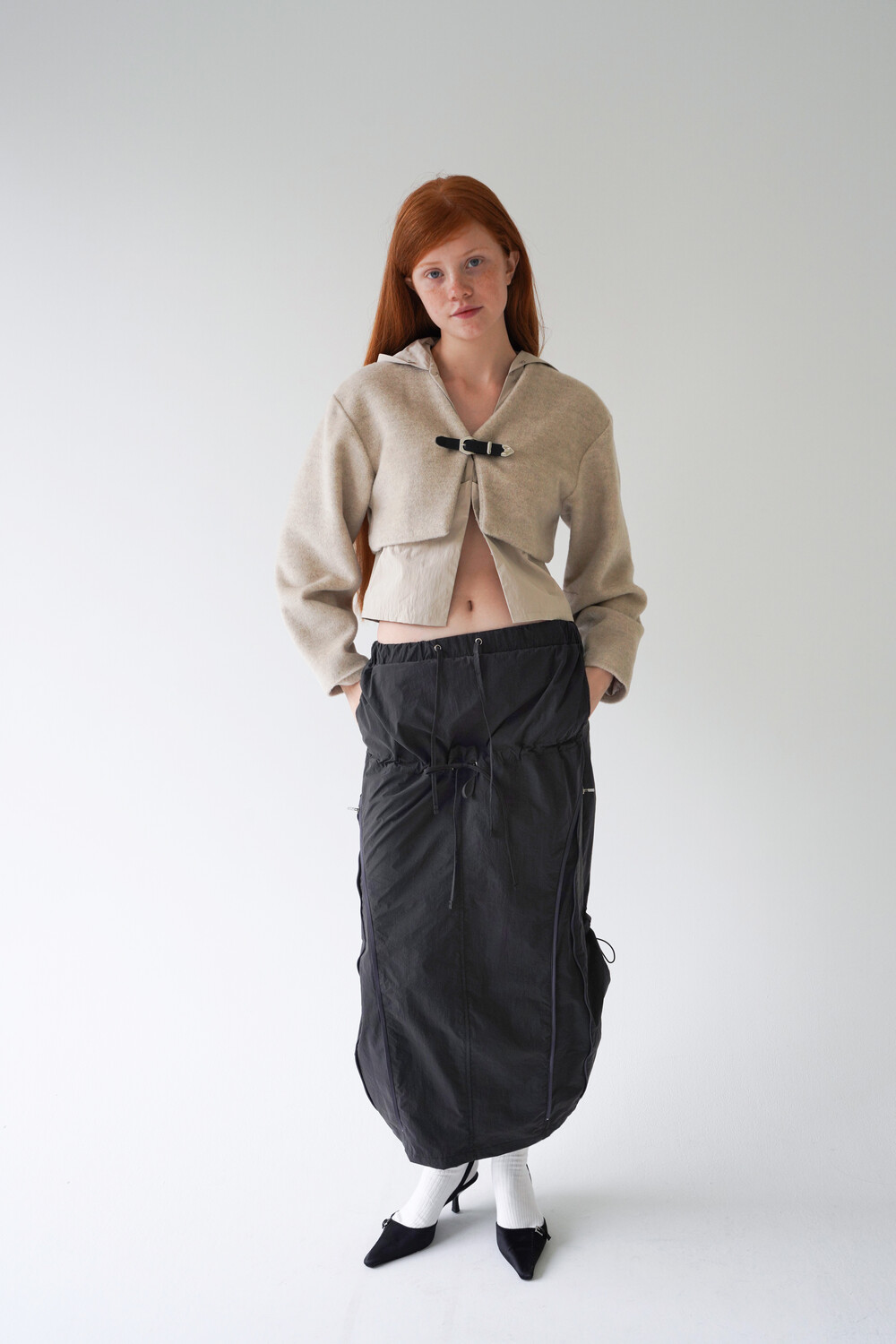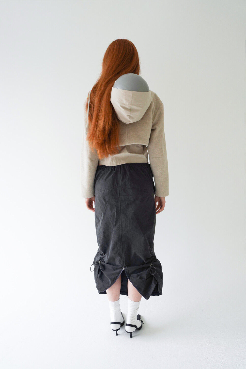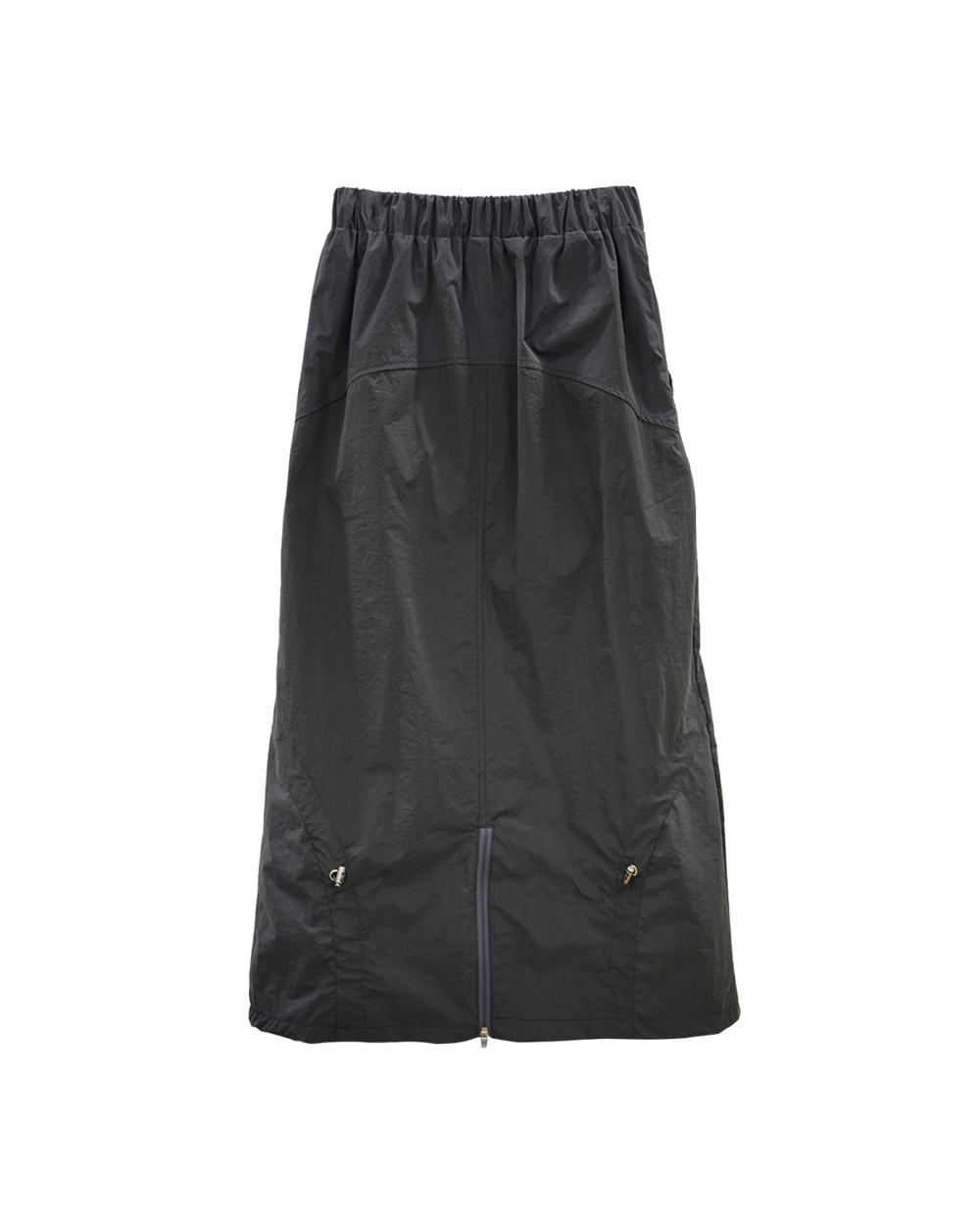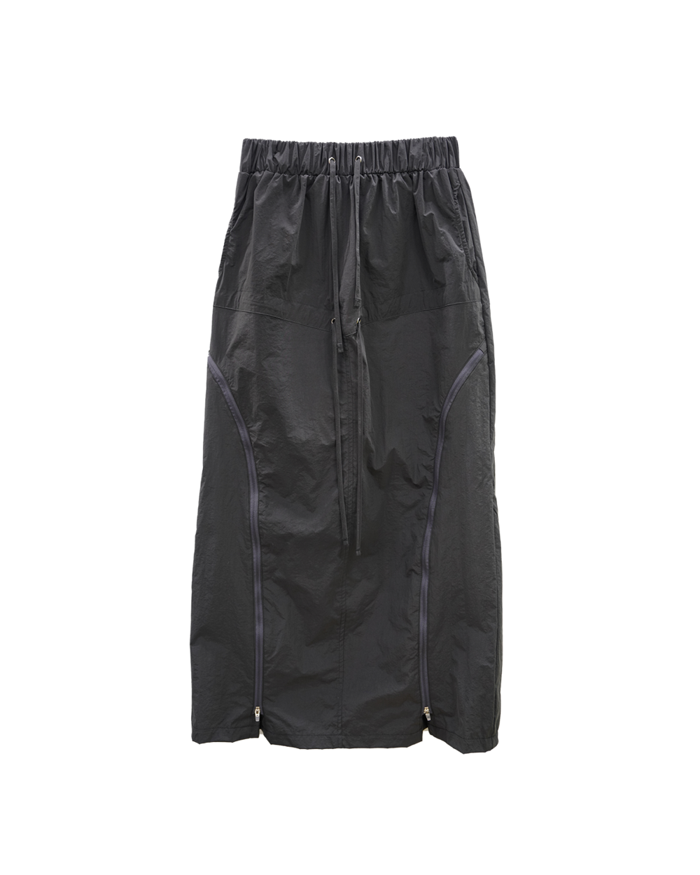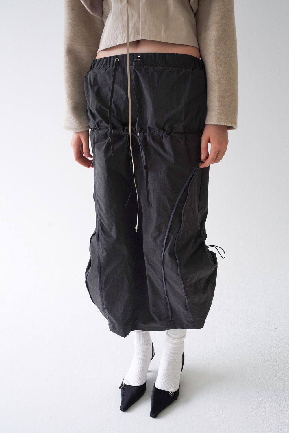 전면의 지퍼와 스트랩 셔링 디테일, 후면의 스트링 조절로 다양한 실루엣 연출이 가능한 스커트입니다.