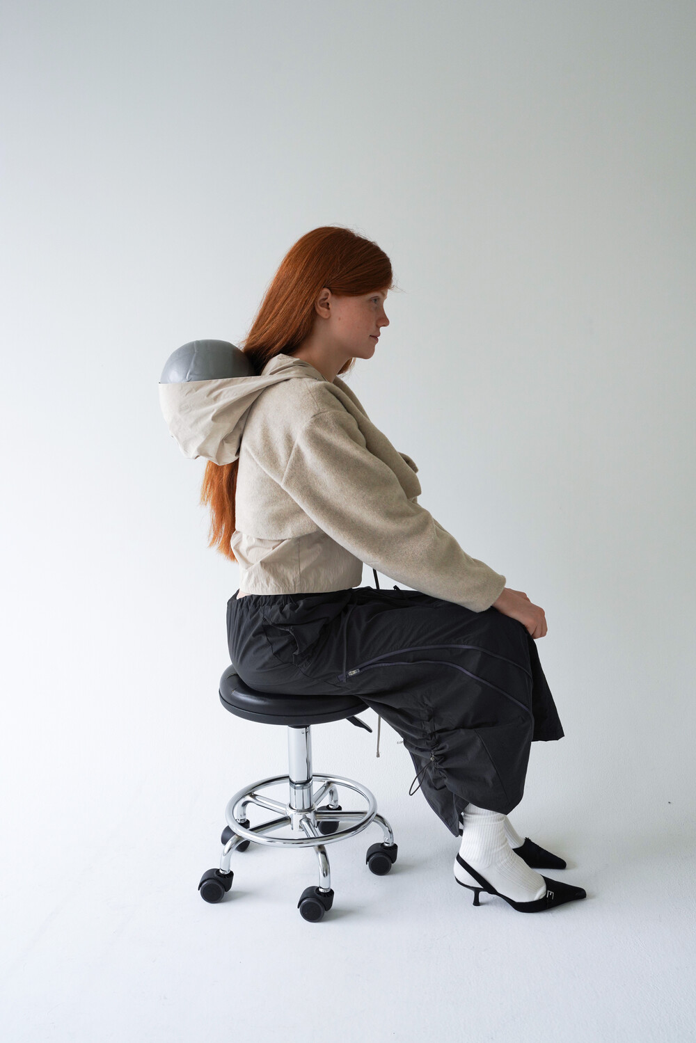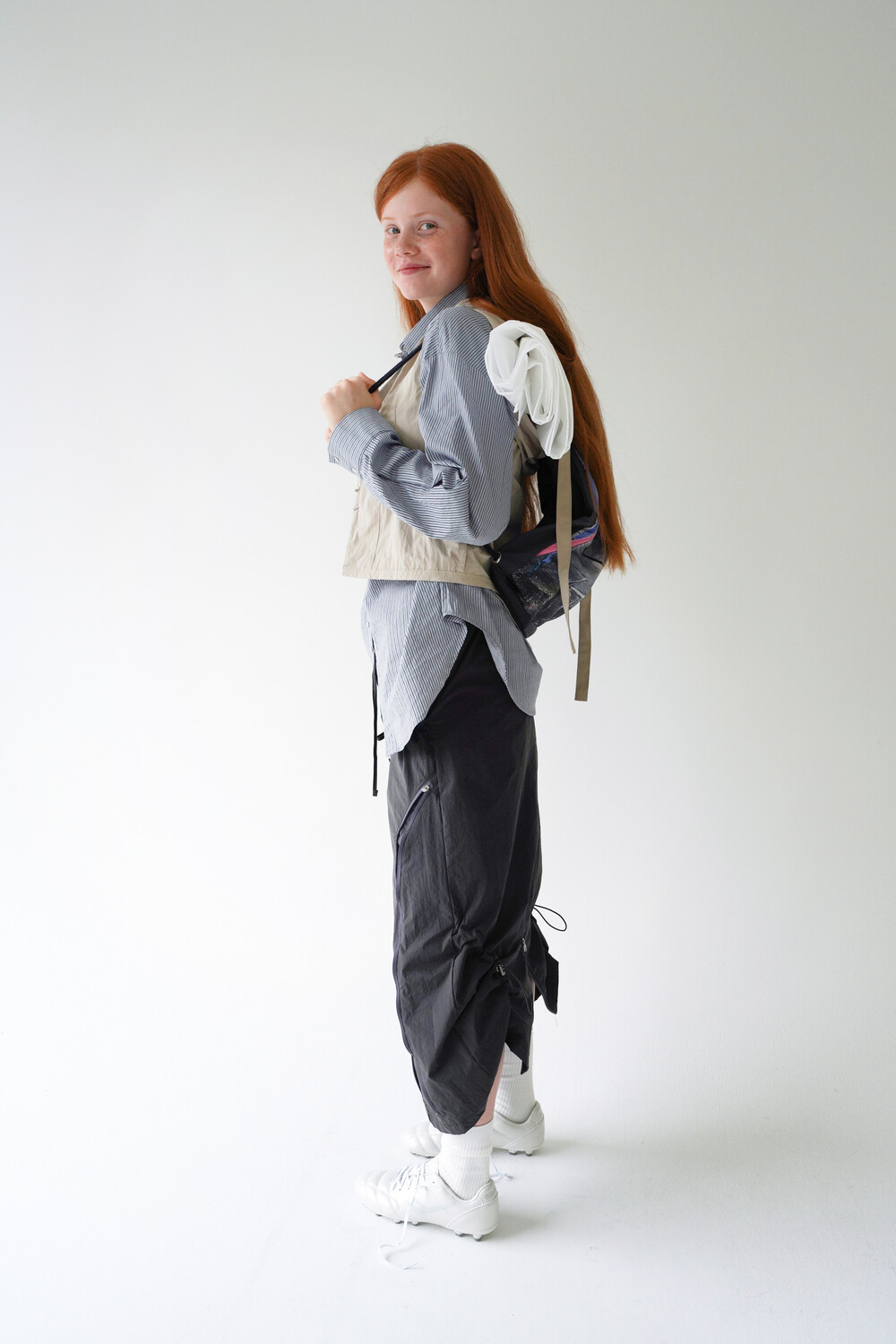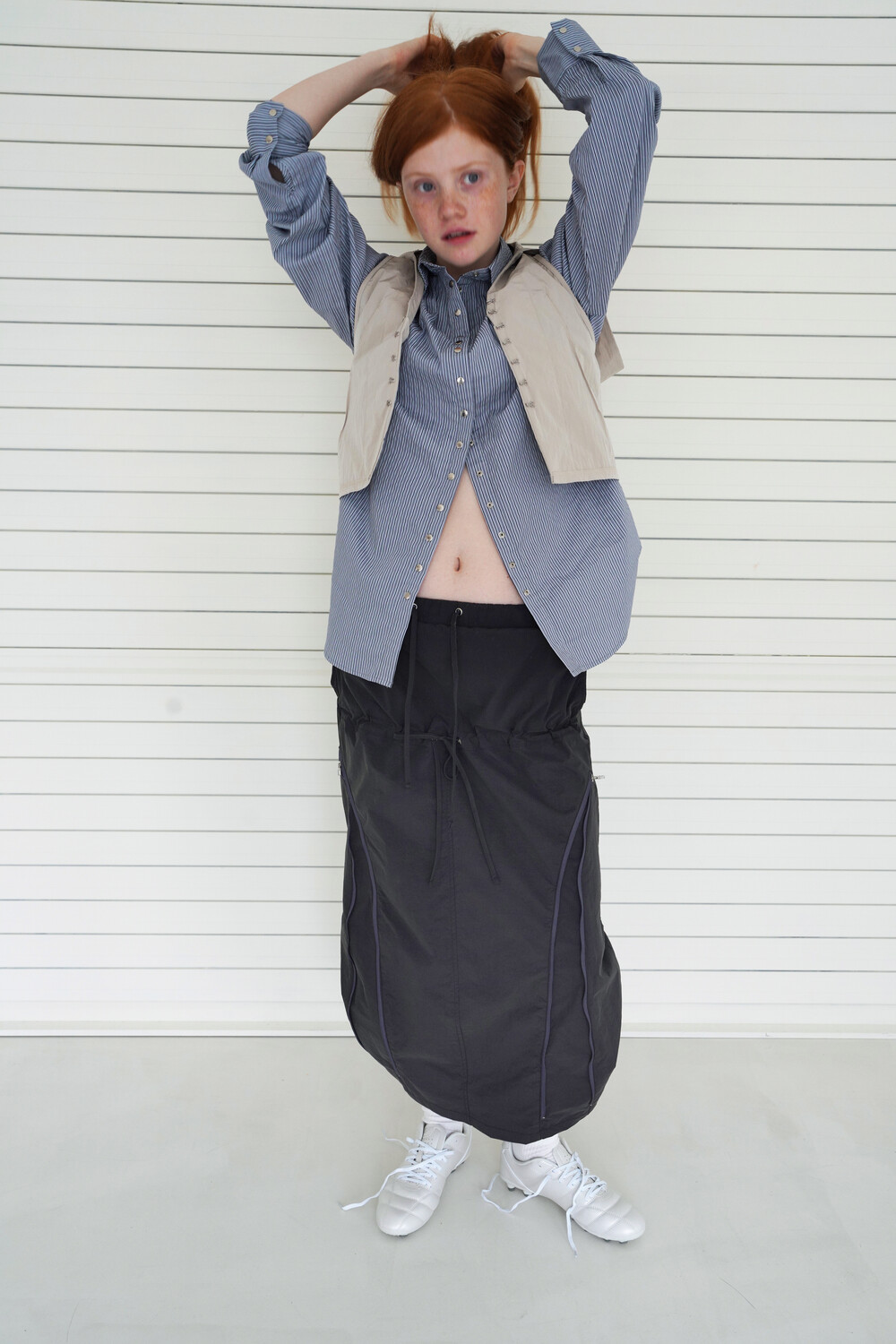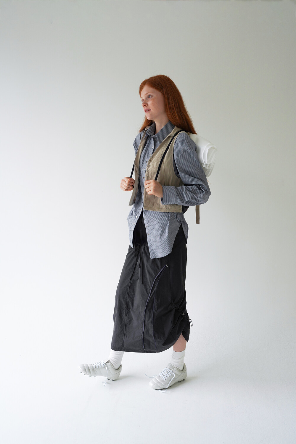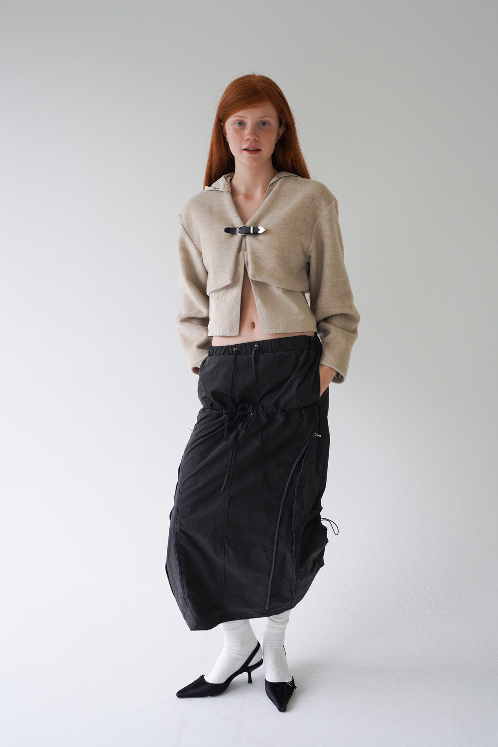 전면의 지퍼와 스트랩 셔링 디테일, 후면의 스트링 조절로 다양한 실루엣 연출이 가능한 스커트입니다.
