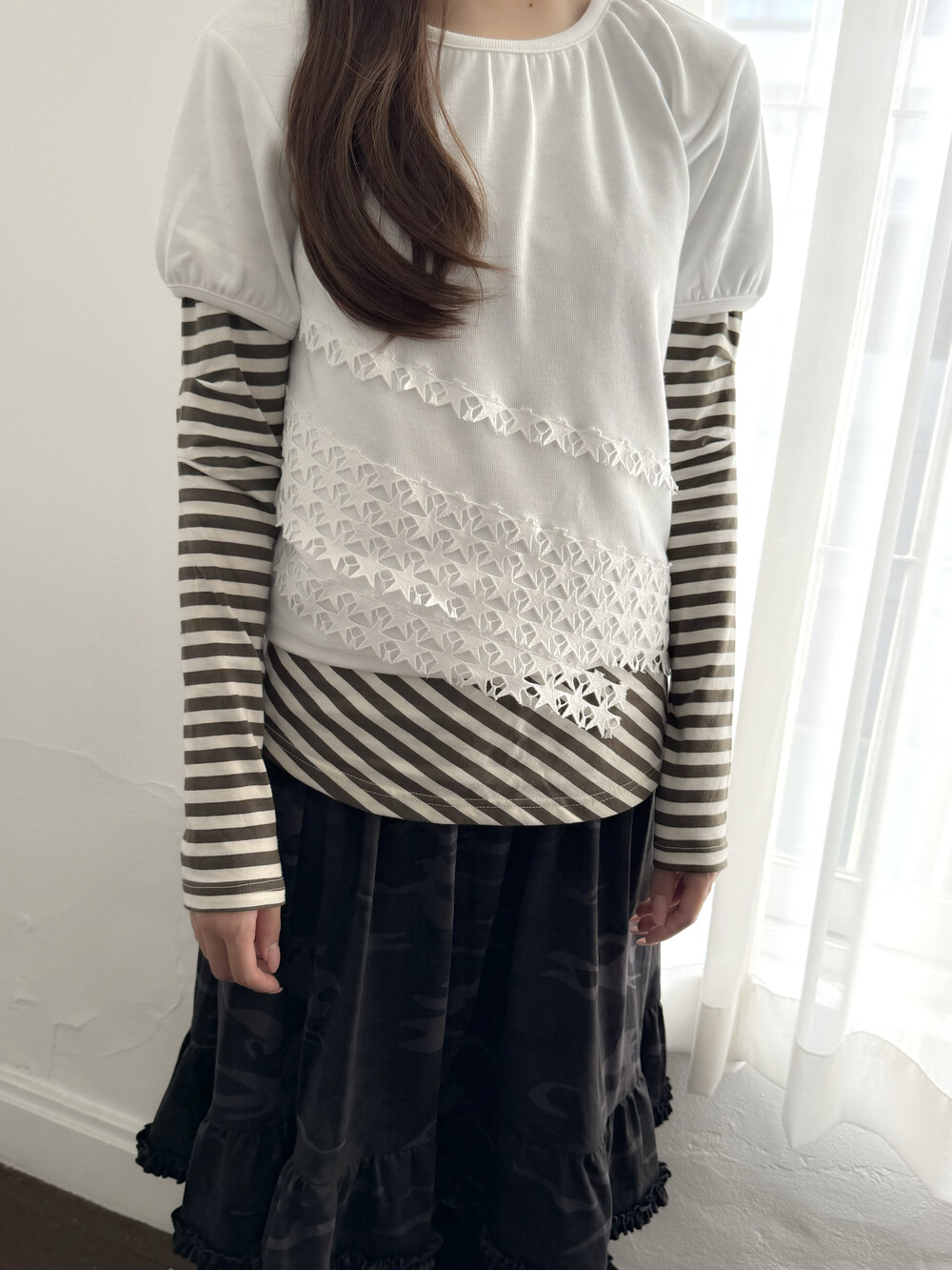 타라카는 샨스크리트어로 별을 의미하는 단어입니다. 이름에 맞게 별 모양의 자수 레이스가 여러겹 덧대어진 탑입니다. 단독으로 혹은 긴 팔의 이너와 함께 레이어드하시면 더욱 특별한 무드로 착용하실 수 있습니다.
