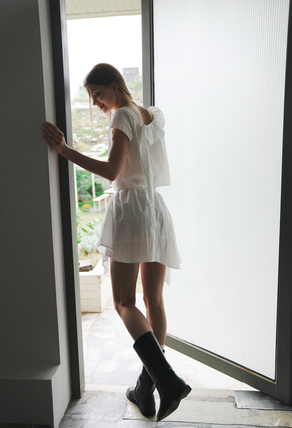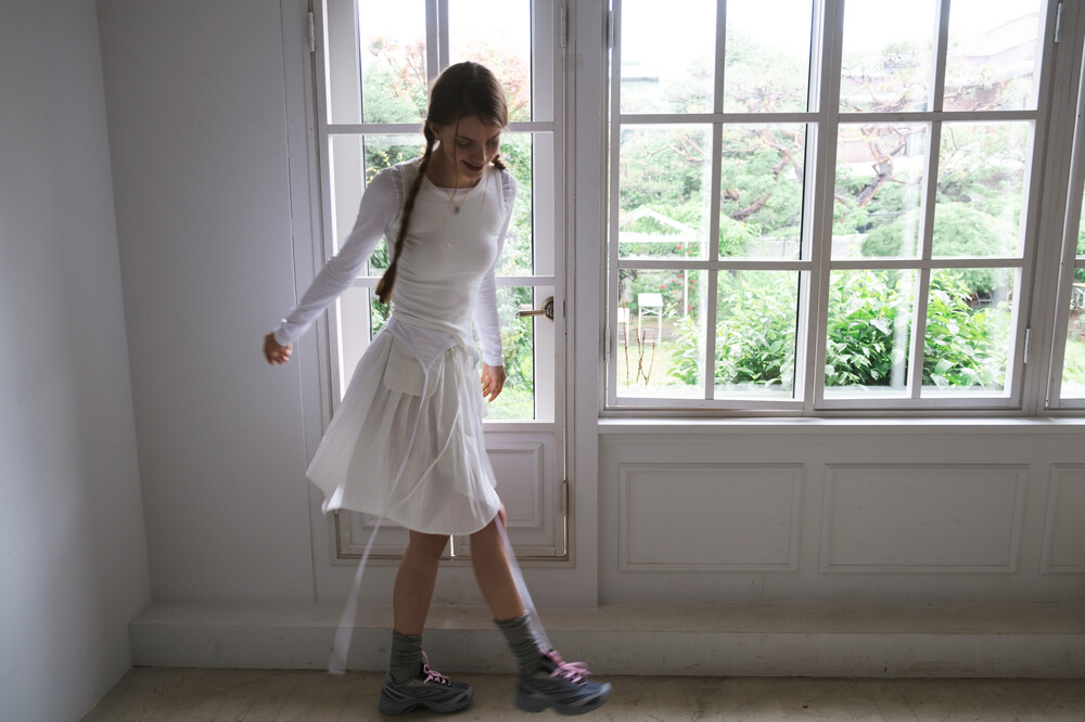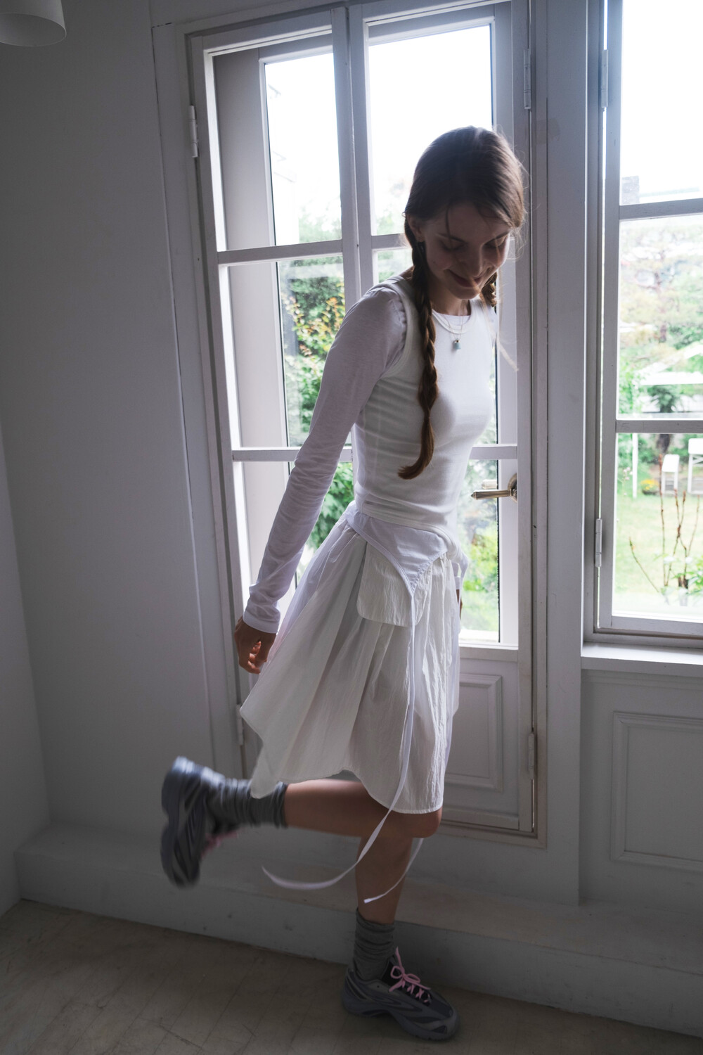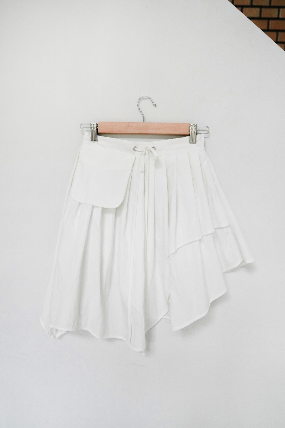 몸을 따라 흐르는 주름과 아웃포켓 디테일이 특징인 스커트입니다. 단독으로도 포인트 아이템이 되어주며,