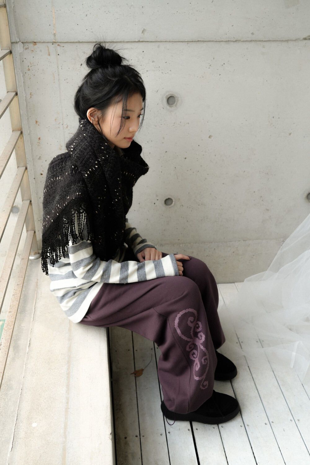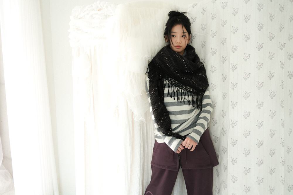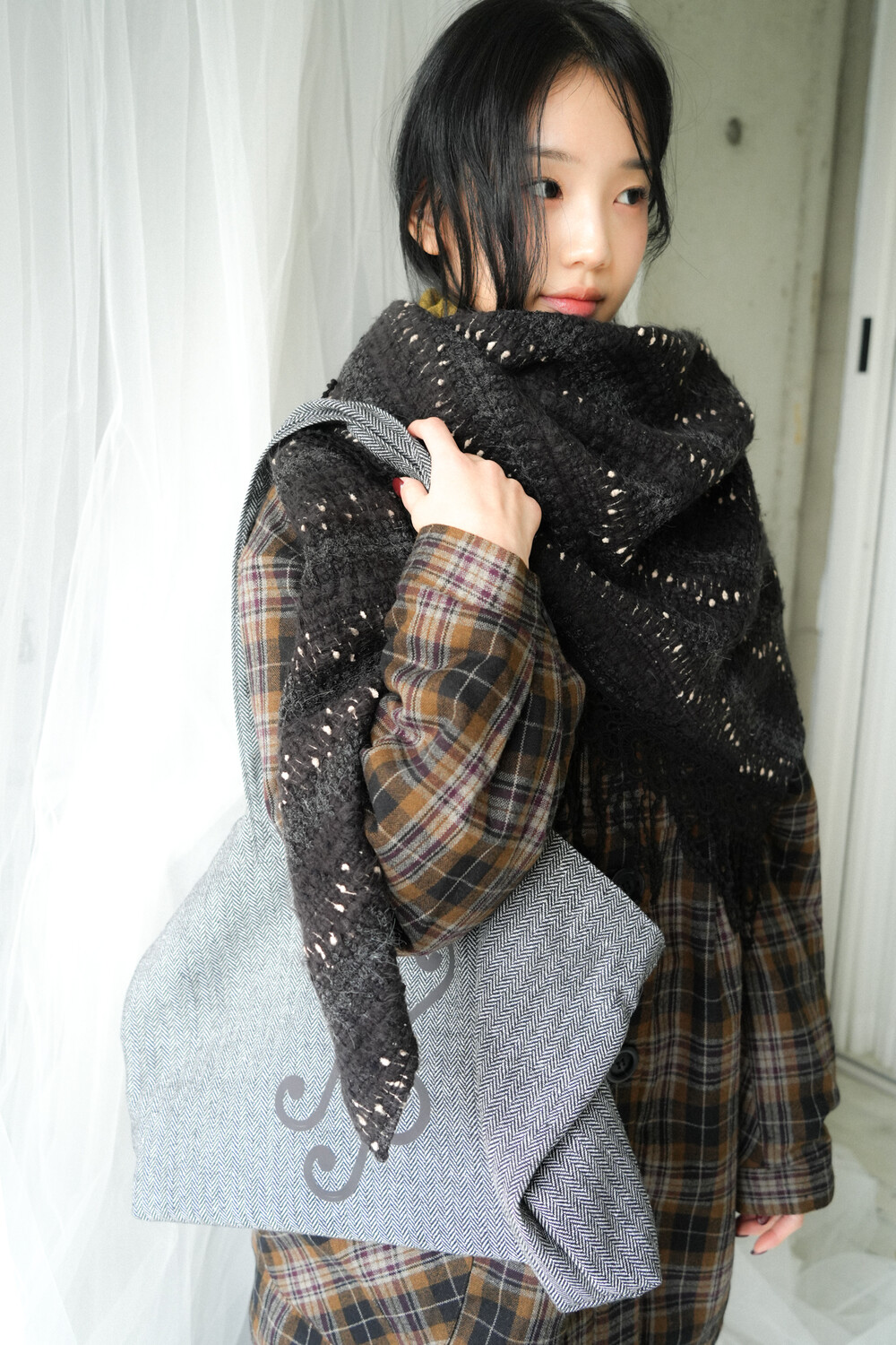 큰 사이즈감으로 착용되는 숄 머플러입니다. 사선 형태와 한쪽면에는 프린지 디테일이 더해져 에스닉한 무드로 즐기실 수 있습니다.