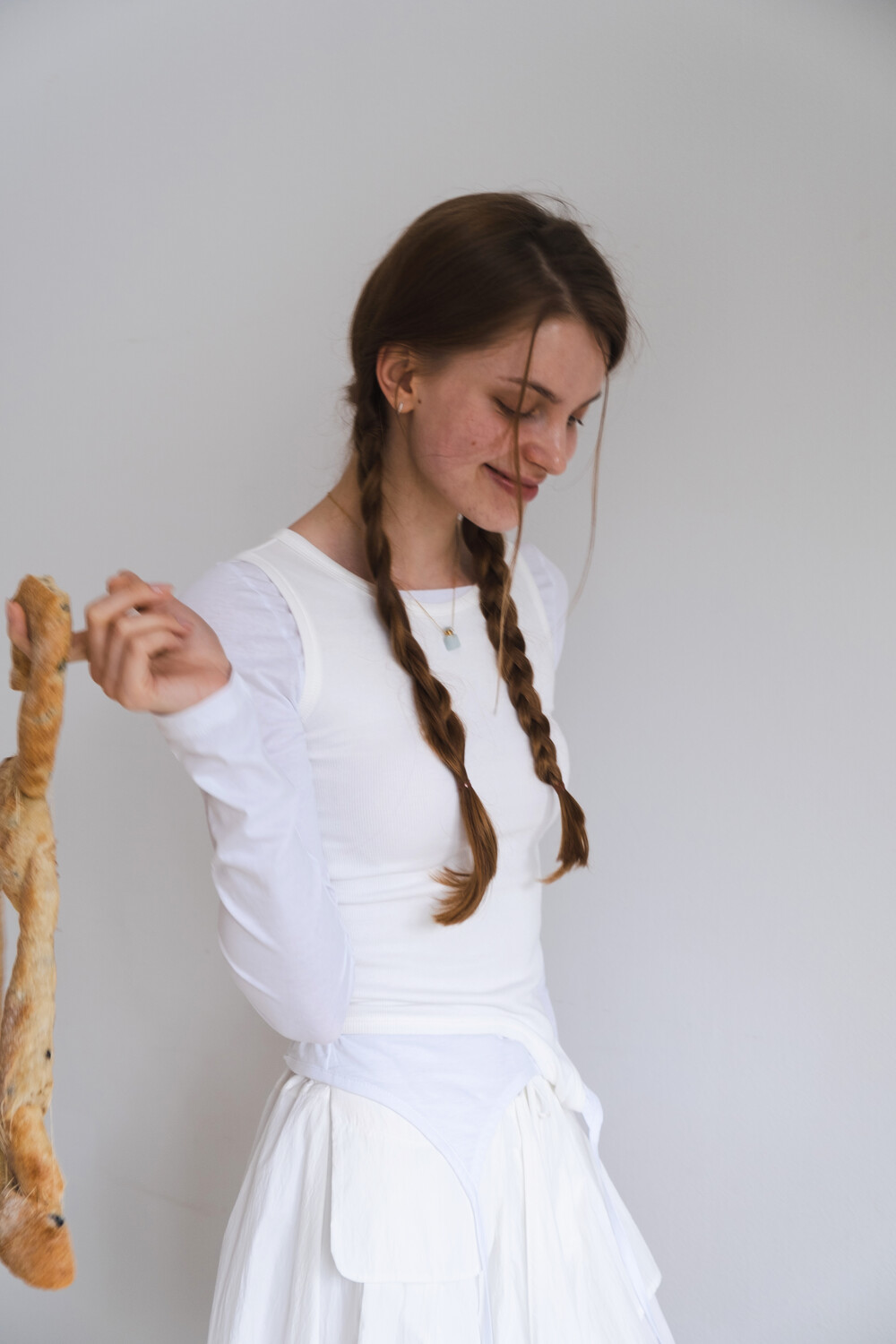 탄성이 좋은 립 조직의 슬리브리스입니다. 투웨이로 착용가능하며 어느쪽으로