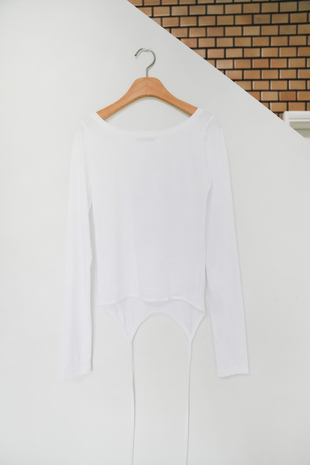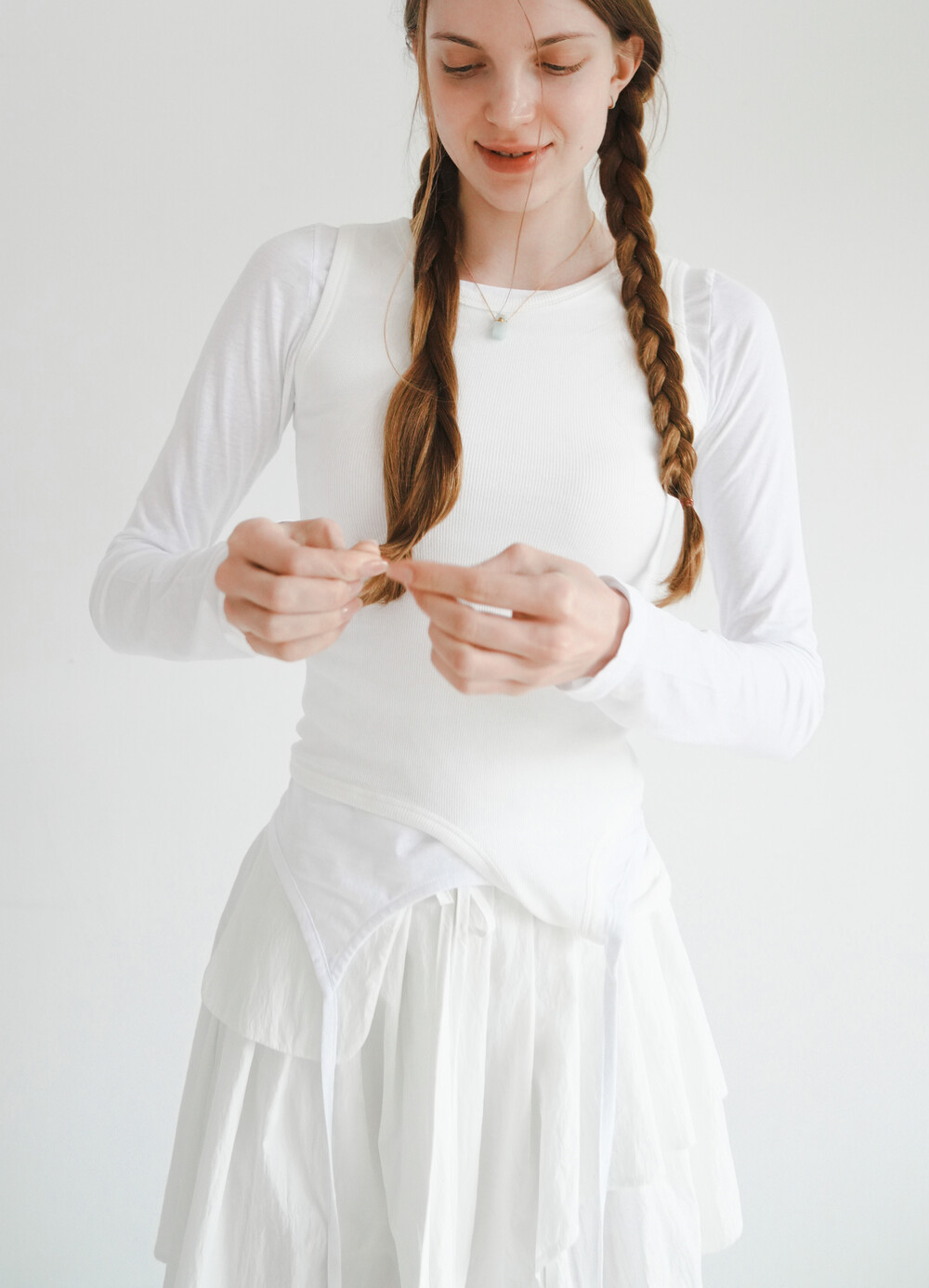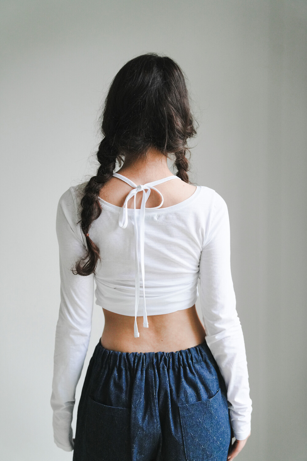 전면의 스트링 디테일이 특징인 탑입니다. 스트링을 묶어 크롭기장의 홀터넥으로도 연출하실 수있습니다.