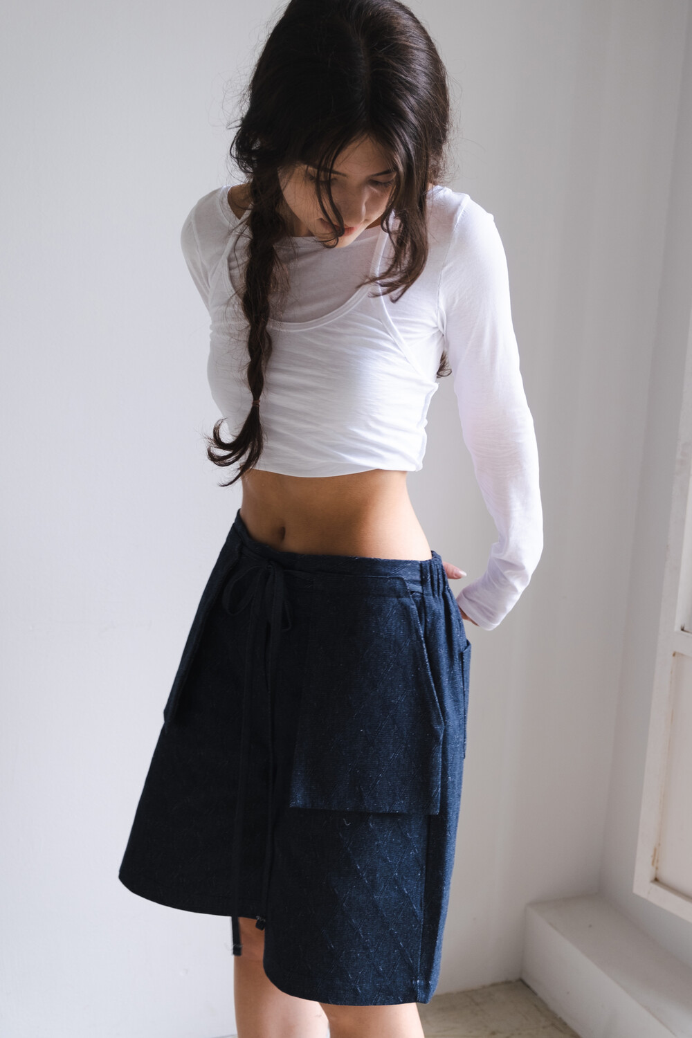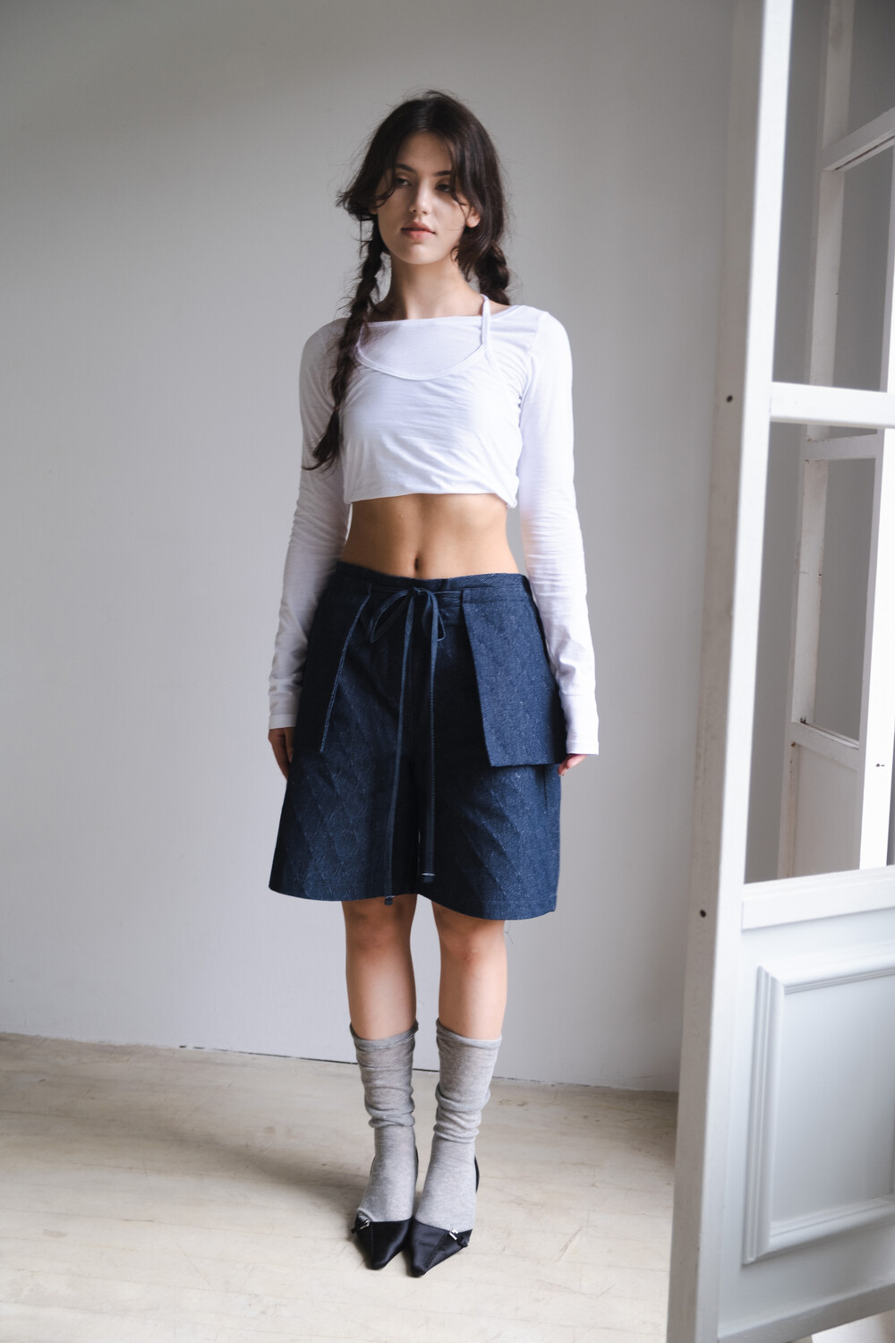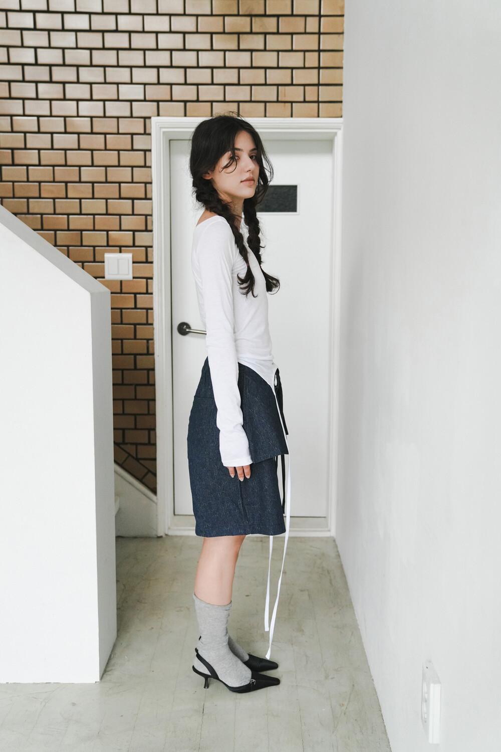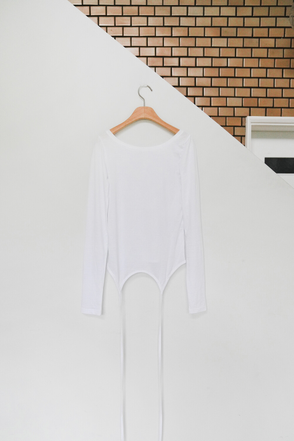 전면의 스트링 디테일이 특징인 탑입니다. 스트링을 묶어 크롭기장의 홀터넥으로도 연출하실 수있습니다.